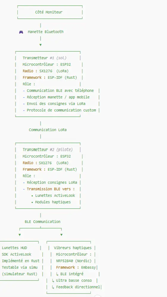 Elles permettent l’affichage d’instructions textuelles simples ou de symboles visuels (flèches, pictogrammes, ou messages courts) lisibles même en plein soleil et positionnés dans le champ visuel sans gêner la vision du relief. - Une manette de jeu programmable, transmettant des instructions depuis le sol par le moniteur.